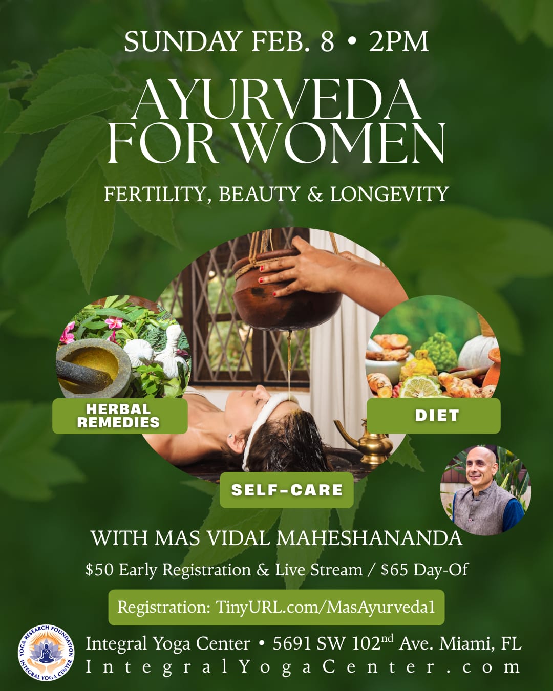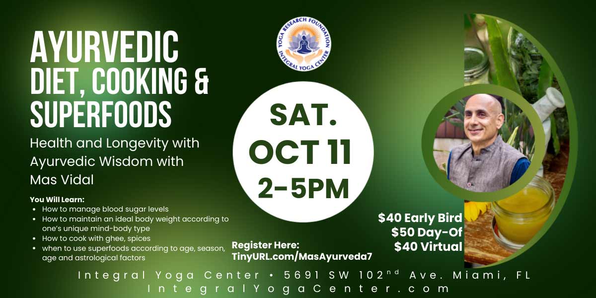 Mas will discuss changes in lifestyle factors between ancient and modern times and how these have influenced the body’s ability to digest starches-sweets and glutenous foods. Learn how to manage blood sugar levels and maintain your ideal weight according to one’s unique mind-body type. Learn how to cook with ghee, spices and when to use superfoods according to age, season , age and astrological factors.